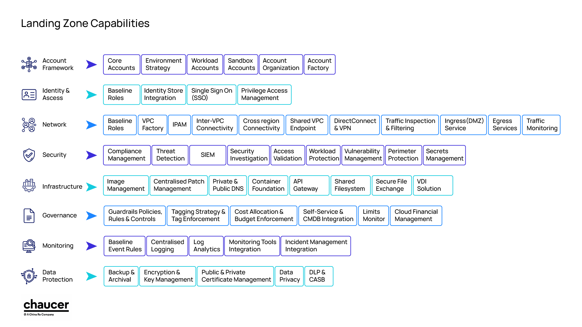 • Account framework: A scalable and organized hierarchy of cloud management accounts.